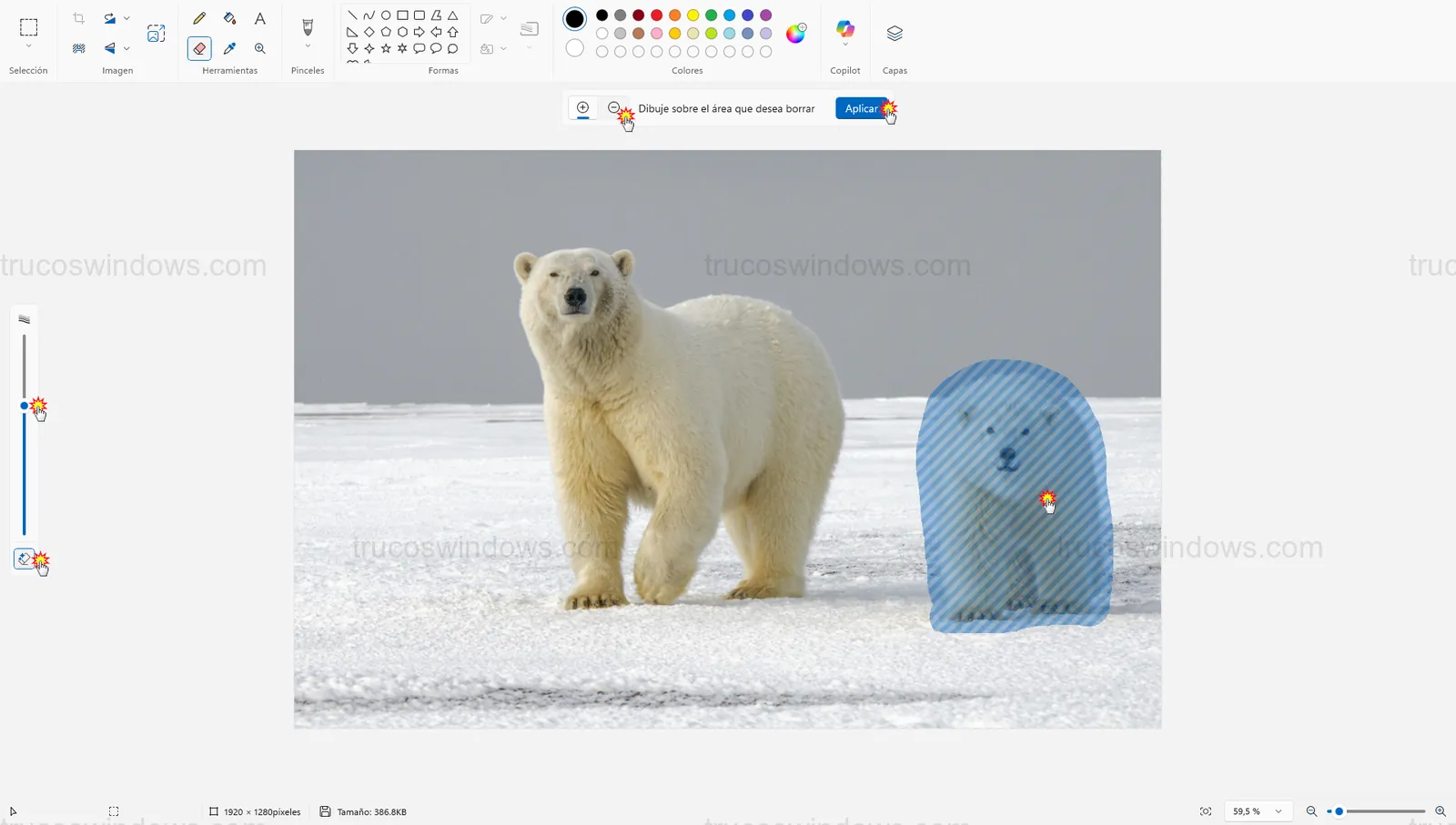 - Mueve el deslizador para ajustar el tamaño del pincel y pinta sobre la zona que deseas hacer desaparecer.