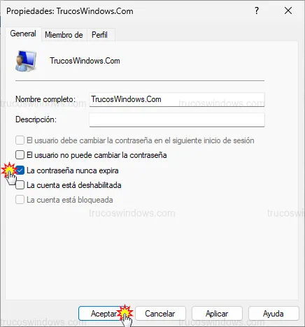 1. Marca la casilla La contraseña nunca expira y pulsa en Aceptar.