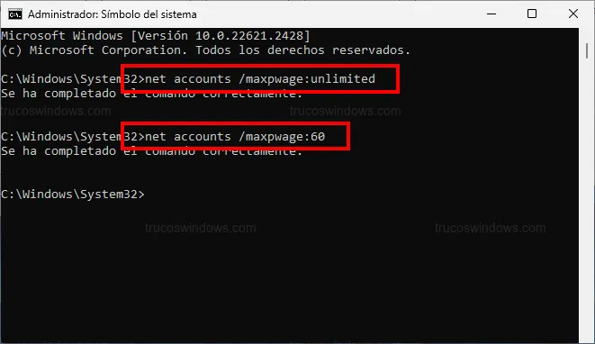 1. Para que nunca expire, escribe: net accounts /maxpwage:unlimited.