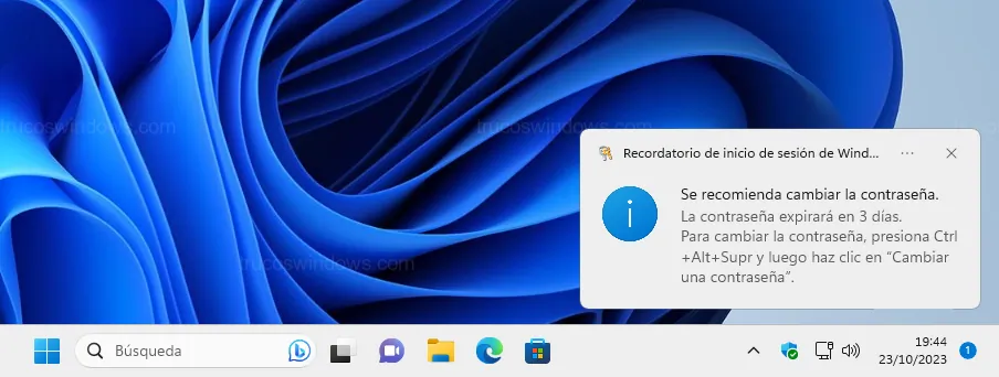 Notificación de Windows avisando de la próxima caducidad de la contraseña de inicio de sesión