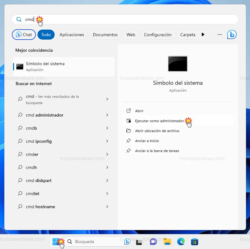 1. Escribe CMD en el buscador de Windows y selecciona Ejecutar como administrador.