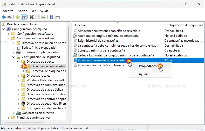 3. Busca Vigencia máxima de la contraseña, haz clic derecho y ve a Propiedades.