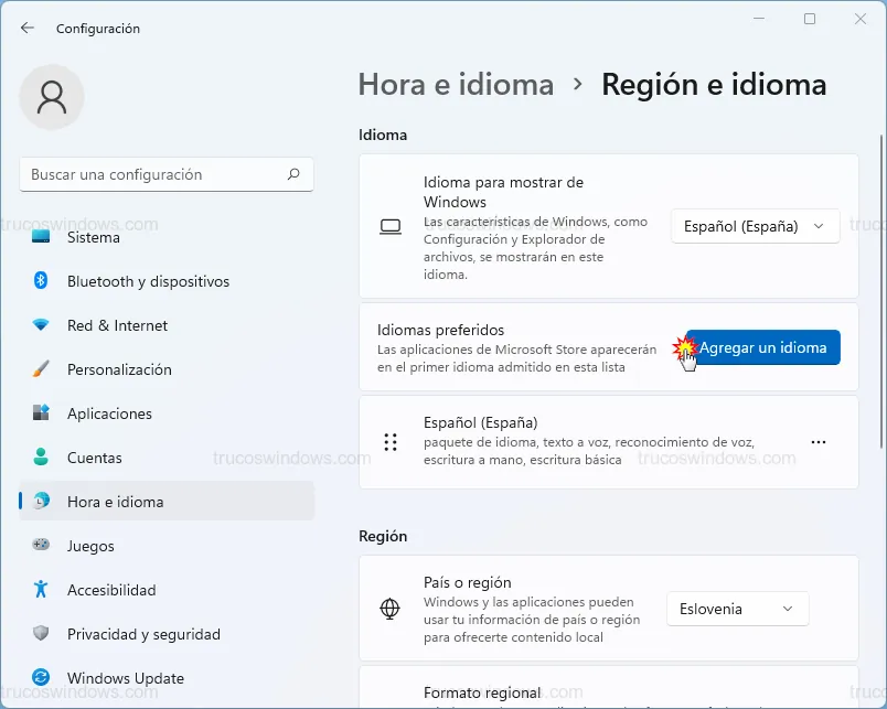 - En la misma pantalla anterior, localiza la sección "Idiomas preferidos" y pulsa el botón Agregar un idioma.