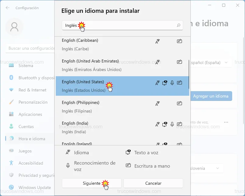 - Busca tu idioma en la lista (ej: Inglés), selecciónalo y haz clic en Siguiente.