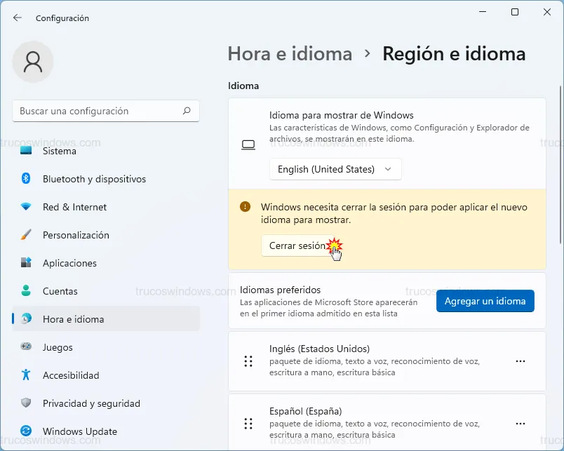 - Importante: Debes pulsar en Cerrar sesión para que Windows aplique los cambios a toda la interfaz.
