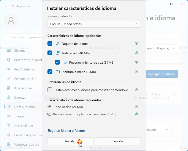 - Marca las características que necesites (Paquete de idioma, Texto a voz, etc.) y pulsa Instalar.