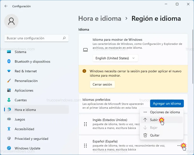- Para que las aplicaciones también cambien, asegúrate de que el nuevo idioma esté en la primera posición de la lista de "Idiomas preferidos" usando los tres puntos y seleccionando Subir.