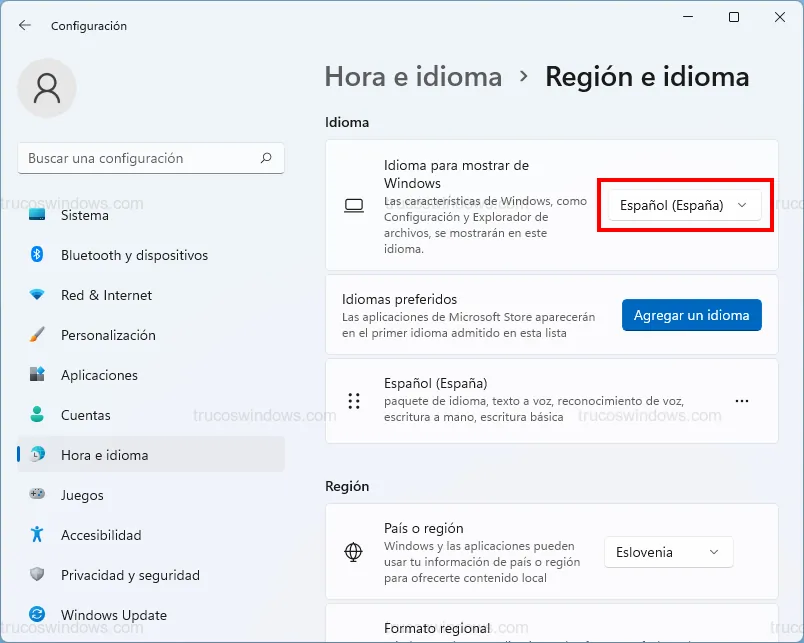 - En Idioma para mostrar de Windows, despliega el menú y selecciona el nuevo idioma.