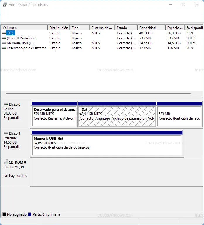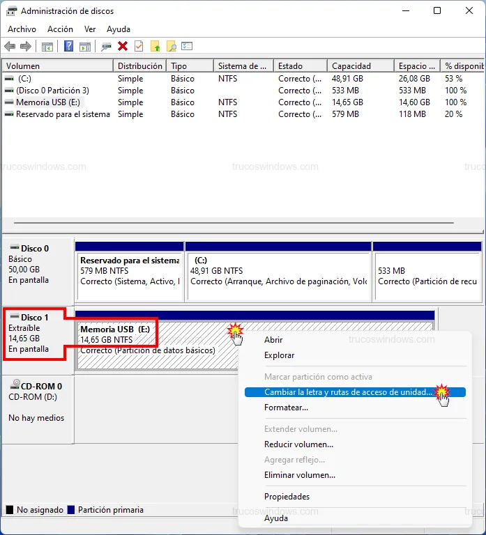 En la ventana que se abre, debes identificar la unidad que quieres modificar. Fíjate en el tamaño y la etiqueta (por ejemplo, el Disco 0 suele ser el sistema y el Disco 1 una unidad extraíble).