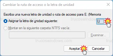 Selecciona la nueva letra en el menú desplegable (por ejemplo, la U:) y pulsa Aceptar.