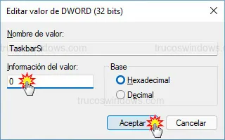 Para aplicar el cambio de dimensiones, haz clic derecho sobre TaskbarSi y selecciona Modificar.... En el campo Información del valor, introduce uno de los siguientes números según tu preferencia:
