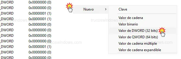 - Selecciona Nuevo > Valor de DWORD (32 bits).