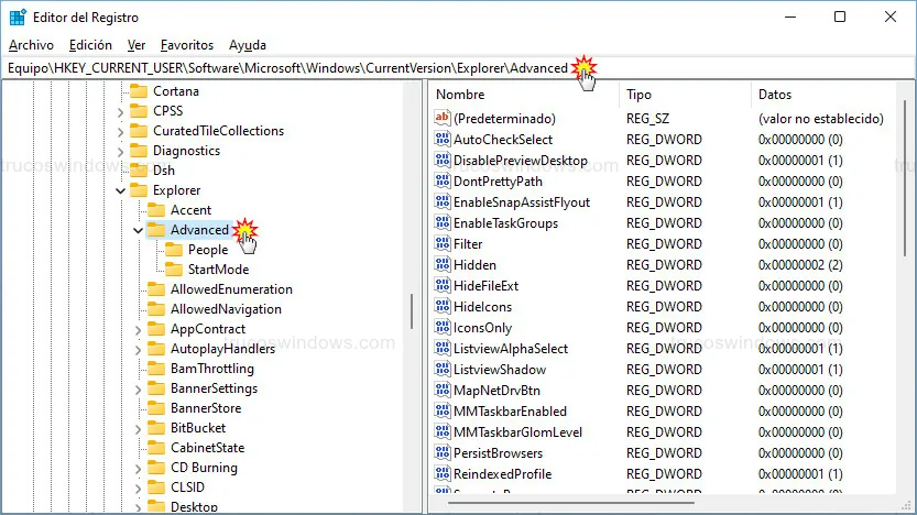 HKEY_CURRENT_USER\Software\Microsoft\Windows\CurrentVersion\Explorer\Advanced