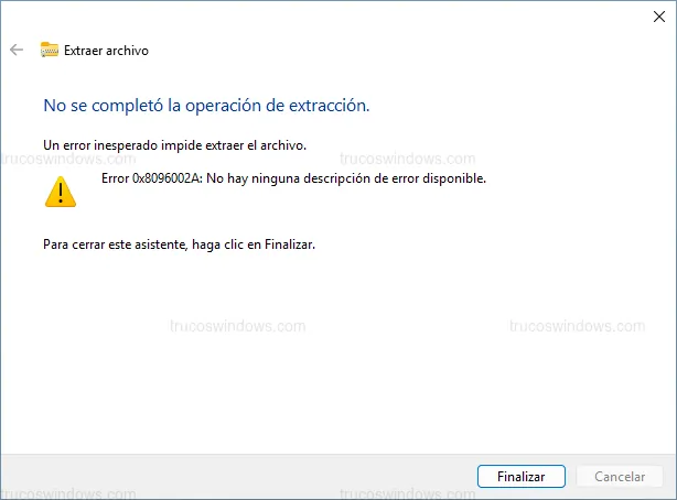 - Archivos con contraseña: Windows 11 no puede descomprimir archivos cifrados. Al intentarlo, mostrará el mensaje Error 0x8096002A: No hay ninguna descripción de error disponible.