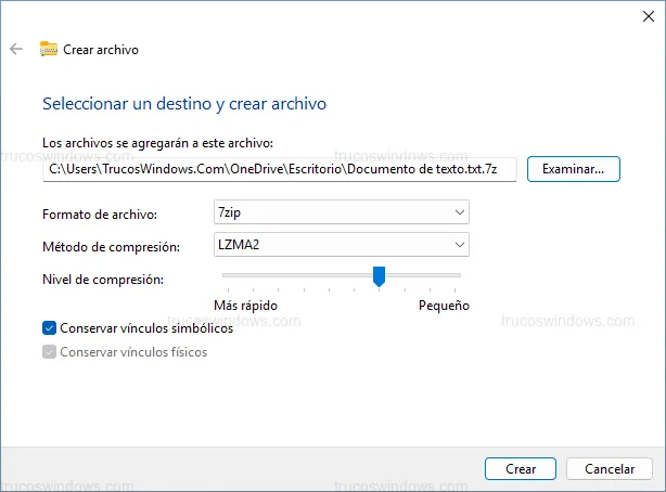 Además, puedes ajustar el Nivel de compresión del 1 (más rápido, archivo más grande) al 9 (más lento, archivo más pequeño). También es posible conservar los vínculos simbólicos (softlinks) y vínculos físicos (hardlinks) marcando las casillas correspondientes antes de pulsar en Crear.