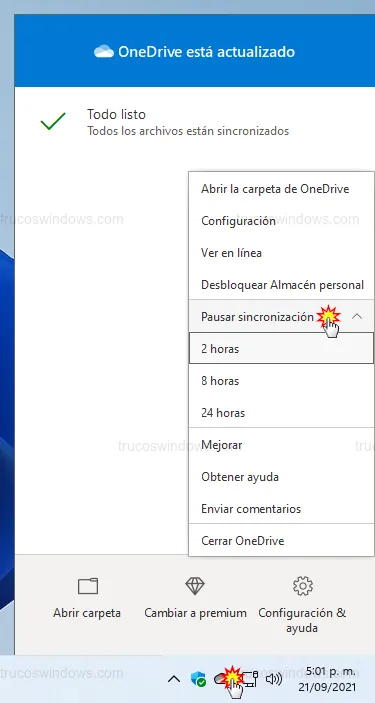 - Haz clic derecho en el icono de la nube (reloj) y selecciona Pausar sincronización (2, 8 o 24 horas).