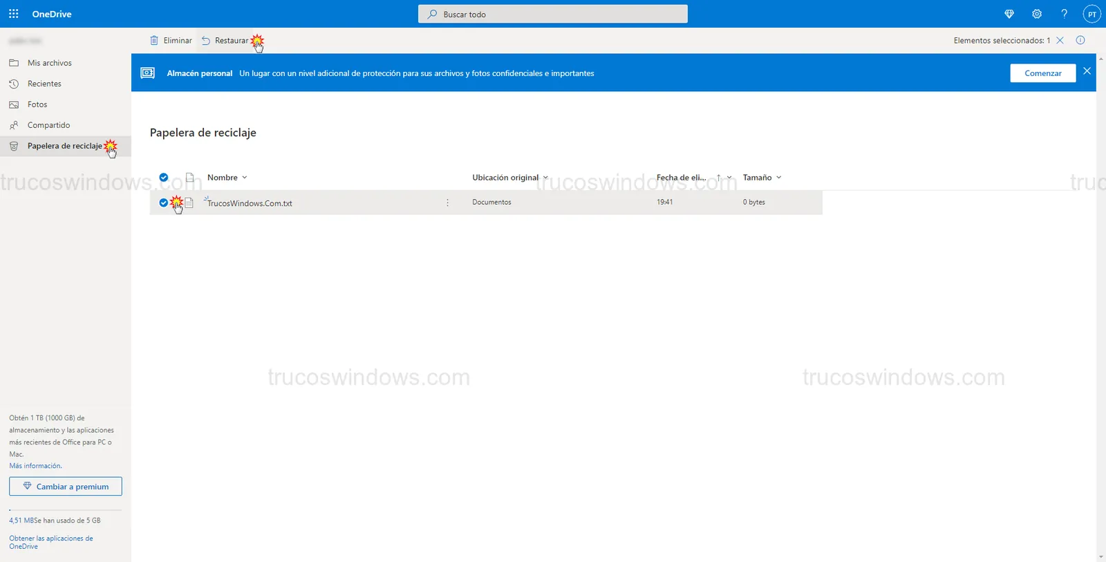 - Papelera de OneDrive (Web): Los archivos borrados permanecen en la nube durante 30 días. Accede vía web, selecciona Papelera de reciclaje en el menú izquierdo y pulsa Restaurar arriba.
