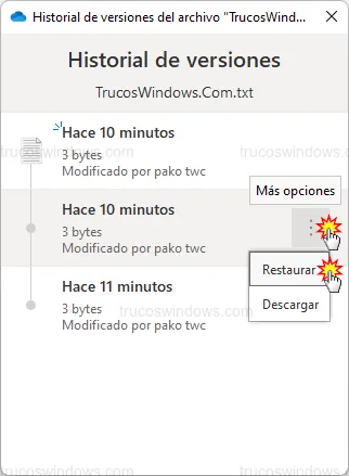 - Aparecerá una ventana con todas las versiones guardadas por fecha. Pulsa en los tres puntos de la versión que necesites y elige Restaurar.