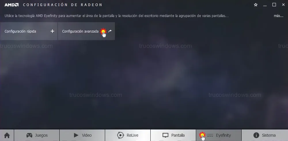 Si quieres jugar en modo ultra-panorámico uniendo todas las pantallas, activa las tecnologías nativas de tu tarjeta gráfica para evitar cortes en la imagen.