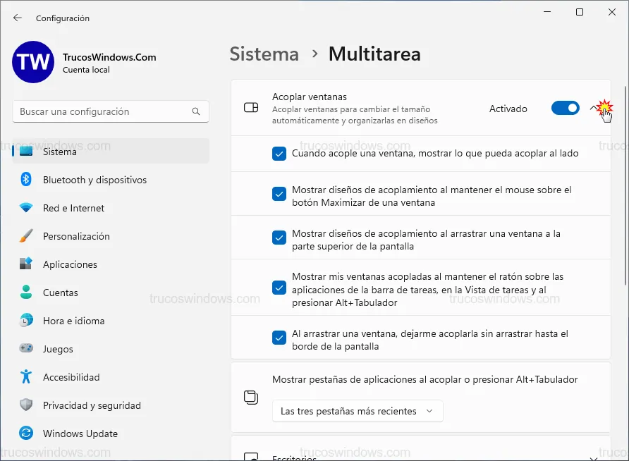 - Mostrar ventanas en Alt+Tab: Decide si quieres ver los grupos de ventanas acopladas al alternar entre aplicaciones.