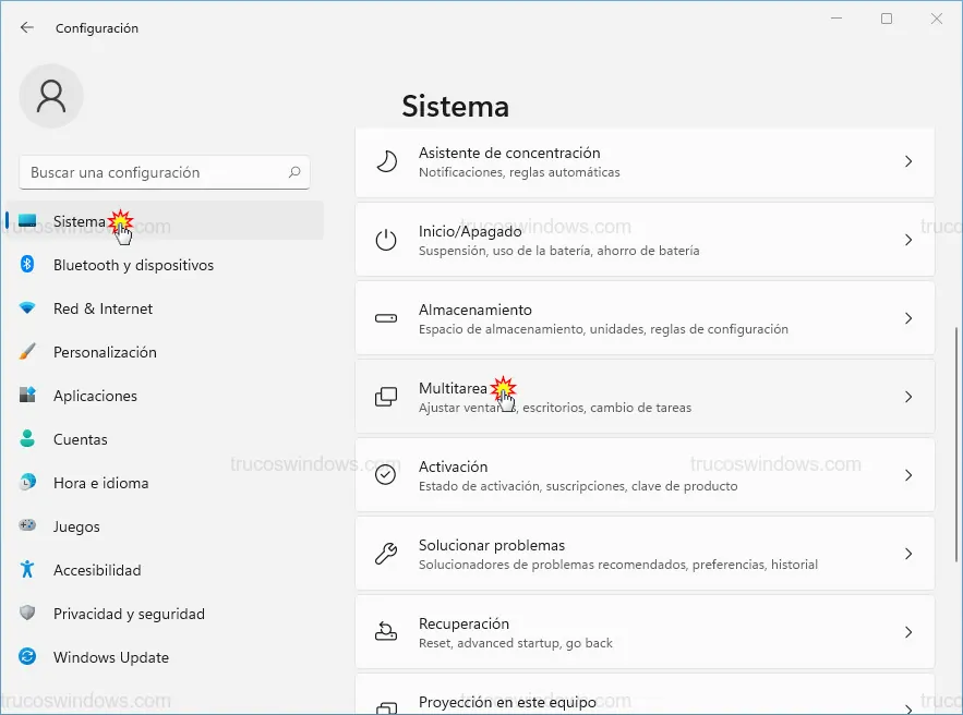 - En el panel lateral izquierdo, asegúrate de estar en la sección Sistema y, en el panel derecho, busca y selecciona Multitarea.