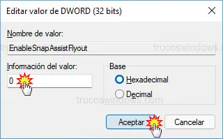 Haz clic derecho sobre EnableSnapAssistFlyout y selecciona Modificar.... Cambia el campo Información del valor de 1 (activado) a 0 (desactivado) y pulsa Aceptar.