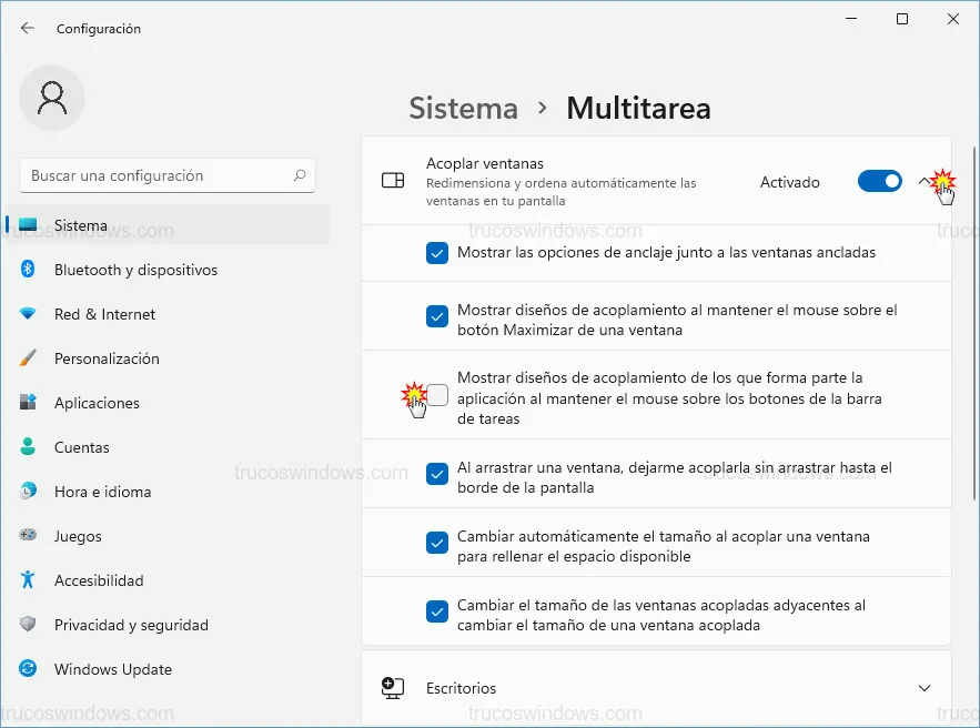 Si no quieres desactivar la función por completo, puedes pulsar sobre la flecha desplegable a la derecha de Acoplar ventanas. Aquí podrás desmarcar casillas específicas, como la que muestra los diseños al pasar el ratón por el botón maximizar, manteniendo el resto de funciones activas.