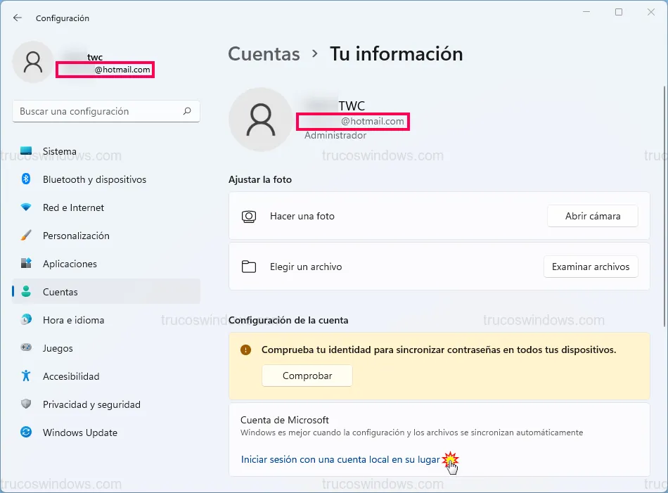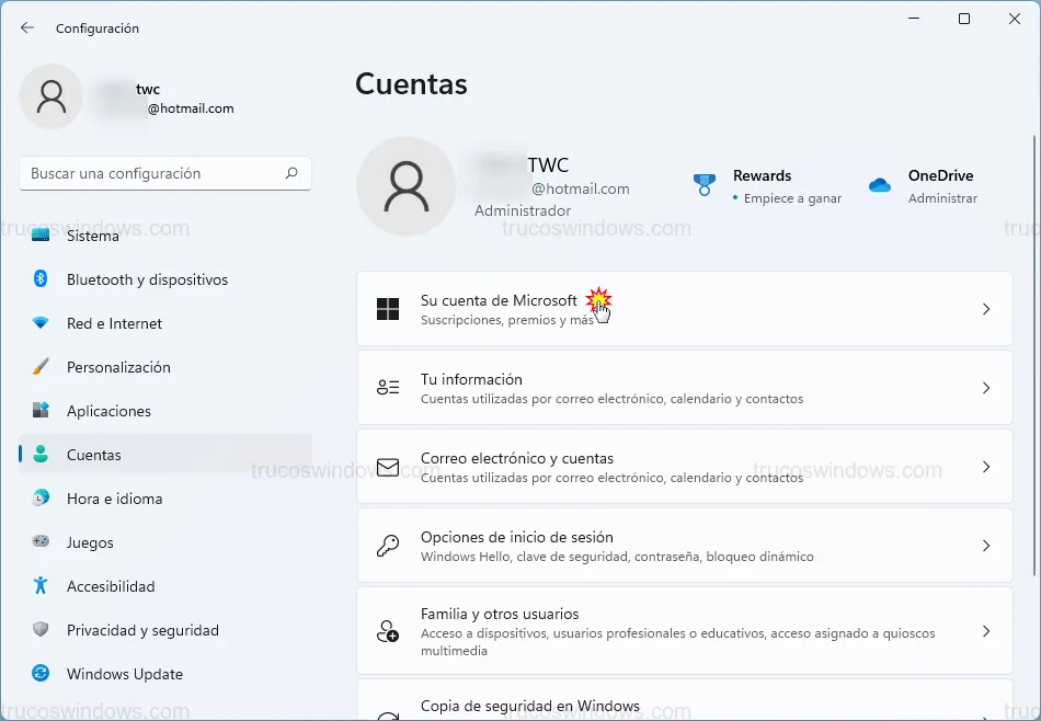 Ve a Configuración (Windows + I) > Cuentas y pulsa en Tu cuenta de Microsoft.