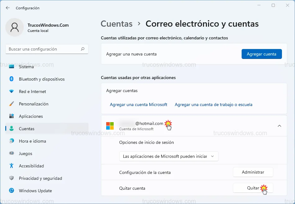 Selecciona la cuenta que quieres eliminar, despliega las opciones y pulsa el botón Quitar.