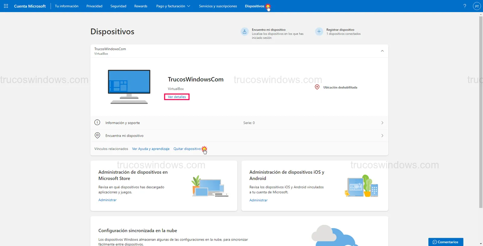 account.microsoft.com, entra en la pestaña Dispositivos. Localiza tu equipo actual y pulsa en Quitar dispositivo. Deberás marcar la confirmación de seguridad para finalizar el proceso.