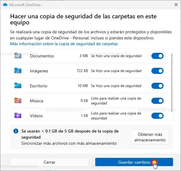 - Pulsa en Configurar la sincronización. Aquí podrás elegir qué carpetas (Escritorio, Documentos, Imágenes) quieres que OneDrive proteja en tiempo real.