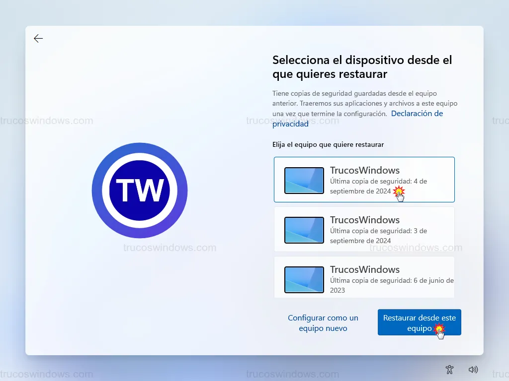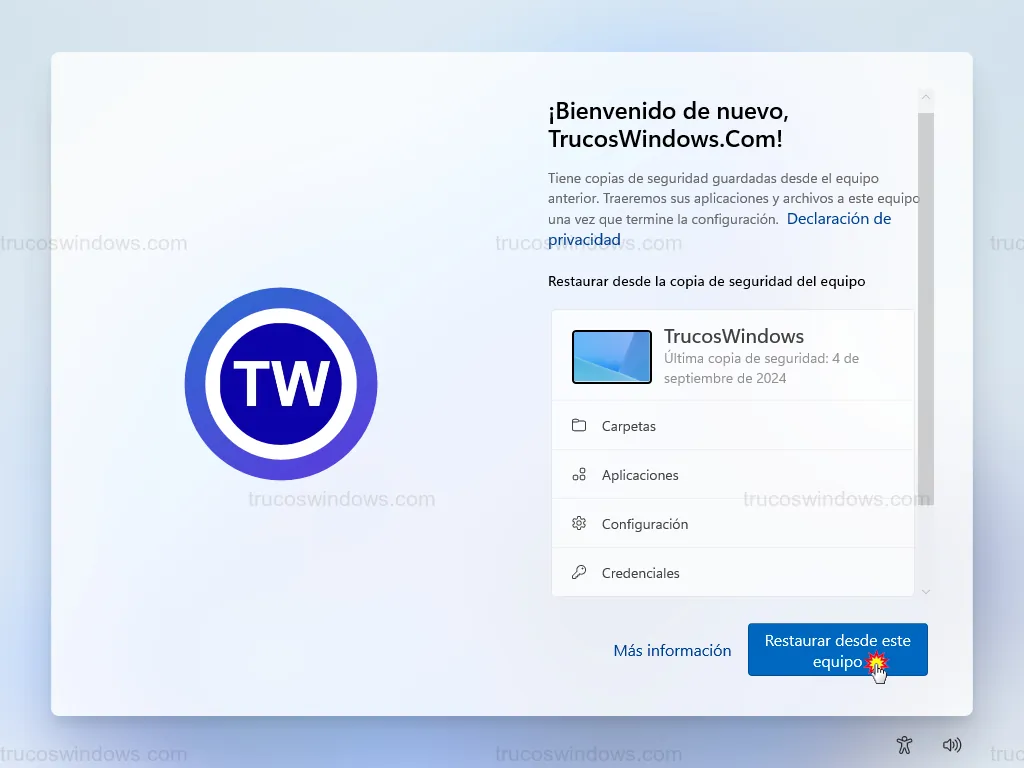 - Windows detectará tu copia y te preguntará si quieres Restaurar desde este equipo.