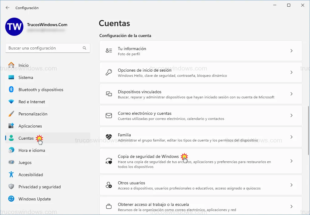 - Ve a Cuentas > Copia de seguridad de Windows.