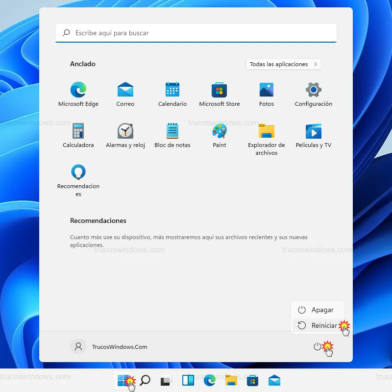 - Sin soltar la tecla, haz clic en el botón de Inicio/Apagado ubicado abajo a la derecha y selecciona Reiniciar.
