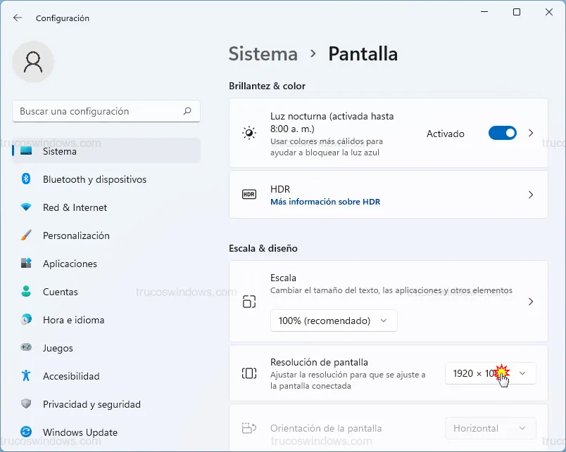 - En Resolución de pantalla, elige siempre la que indique (Recomendado), que coincide con la nativa.