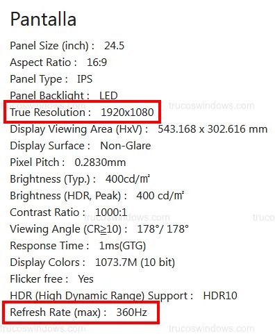- Consulta el manual: Busca términos como Max Refresh Rate y Native Resolution.