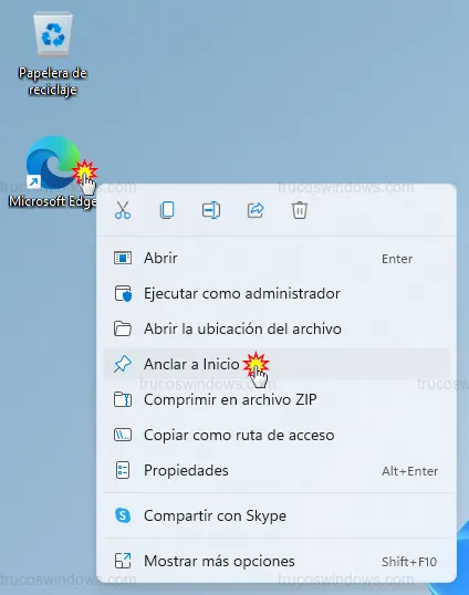 Tener nuestras herramientas a mano es vital. Para anclar un programa, simplemente hacemos clic derecho sobre el ejecutable, un acceso directo o una carpeta, y seleccionamos Anclar a Inicio.