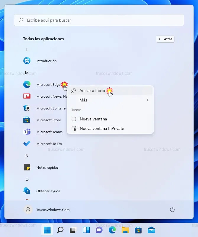 También podemos hacerlo desde la lista completa de programas: mostramos Todas las aplicaciones, hacemos clic derecho sobre la deseada y elegimos la misma opción.