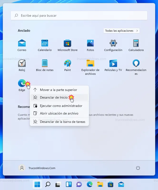 Para desanclar, pulsamos con el botón derecho sobre el icono dentro del menú y seleccionamos Desanclar de Inicio.