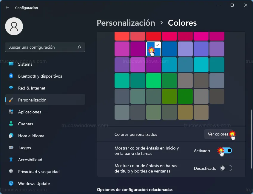 - Activamos la casilla Mostrar color de énfasis en Inicio y en la barra de tareas.