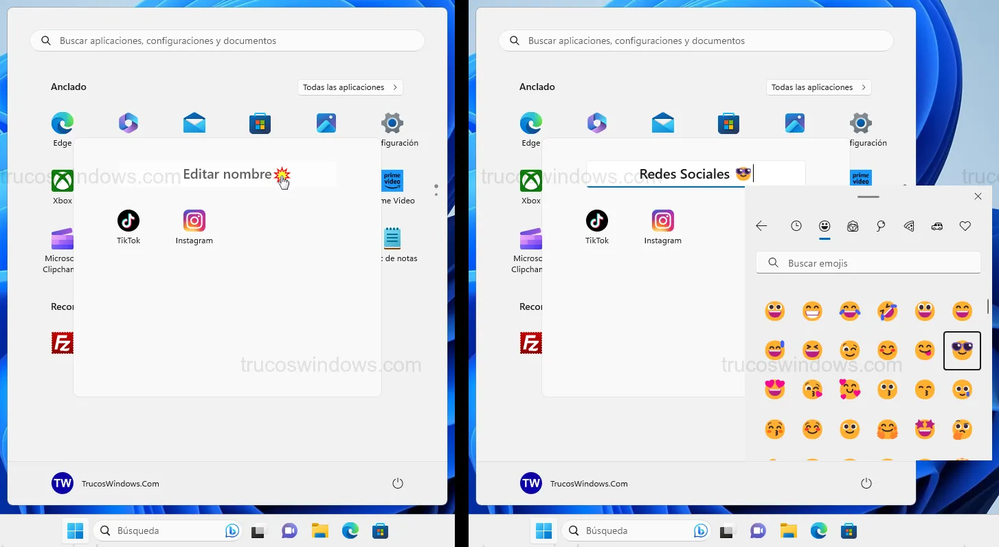 Truco: Puedes incluir emojis en el nombre presionando Windows + . (punto). Una vez escrito el nombre, pulsa Intro para guardar los cambios.