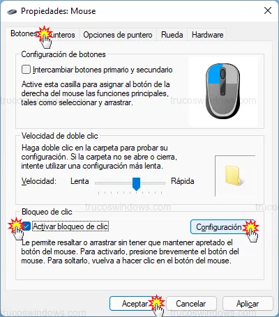 En la pestaña Botones, ajusta el deslizador de Velocidad de doble clic. Puedes probarlo haciendo doble clic en el icono de la carpeta de prueba a la derecha.