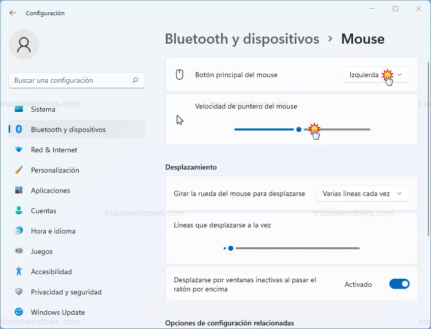 Si eres zurdo o prefieres una sensibilidad distinta, ajusta el comportamiento principal en Configuración > Bluetooth y dispositivos > Mouse.