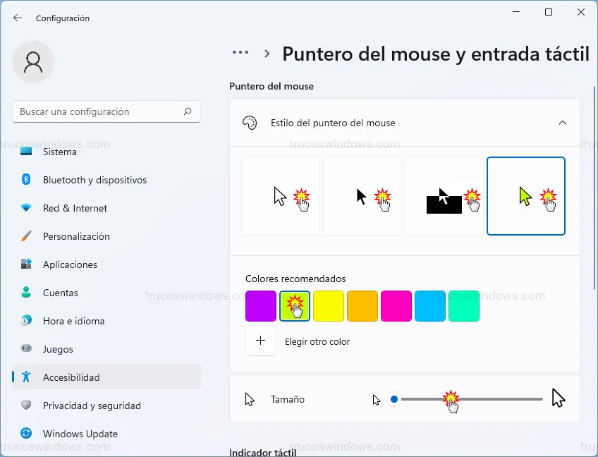 - En el panel izquierdo, accede a Accesibilidad y luego a Puntero del mouse y entrada táctil.