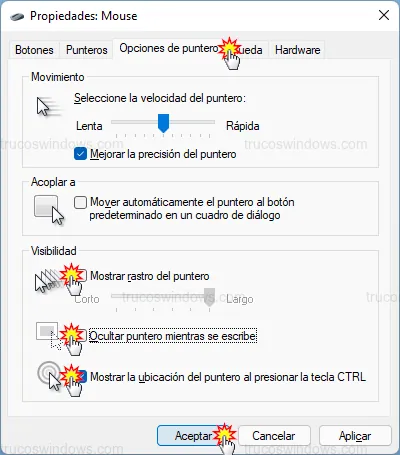 En la pestaña Opciones de puntero, puedes mejorar la visibilidad con estas funciones:
