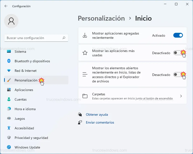 Desactivadoen la opción Mostrar las aplicaciones más usadas. - Ocultar historial de archivos: Para que no aparezcan los documentos abiertos recientemente, desactiva la opción Mostrar los elementos abiertos recientemente en Inicio, listas de accesos directos y el Explorador de archivos.