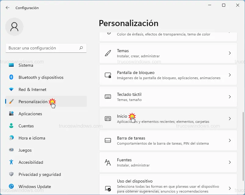 - En el panel de categorías de la parte izquierda, pulsa sobre Personalización.