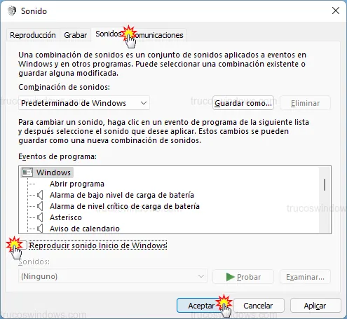 Se abrirá la ventana clásica de Sonido. Asegúrate de estar en la pestaña Sonidos y realiza la siguiente acción: