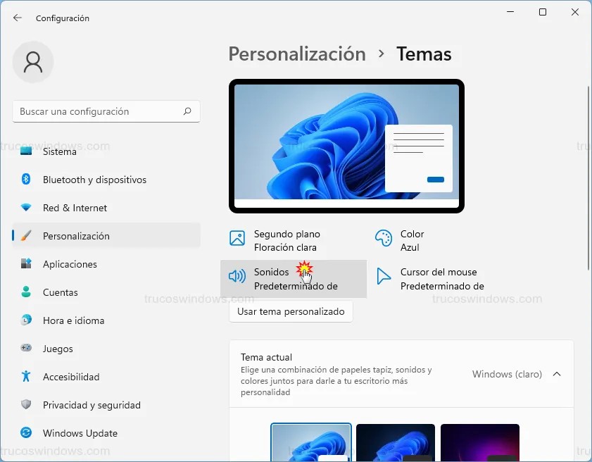 Una vez dentro de Temas, localiza y pulsa sobre el botón denominado Sonidos: Predeterminado de Windows (o el nombre del esquema que tengas activo actualmente).