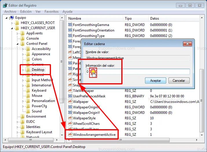 Con la carpeta Desktop seleccionada, debemos buscar en el panel derecho el valor de cadena denominado WindowArrangementActive. En caso de que no lo encuentres, deberás crearlo manualmente: